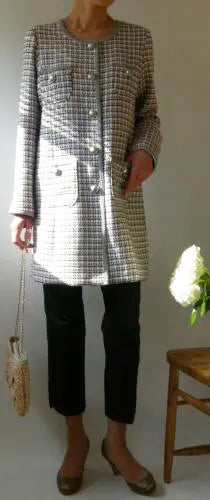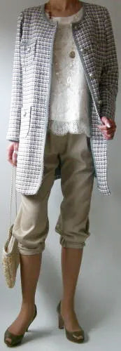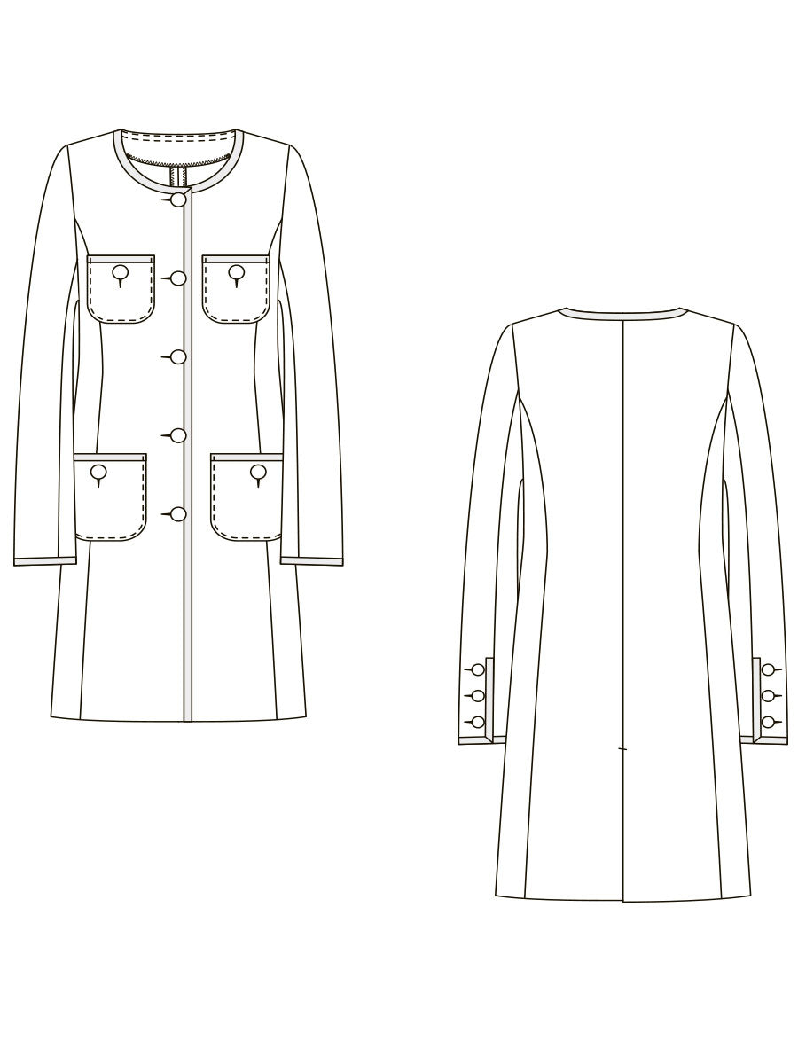 丸みのあるノーカラーが顔まわりをやわらかく見せ、